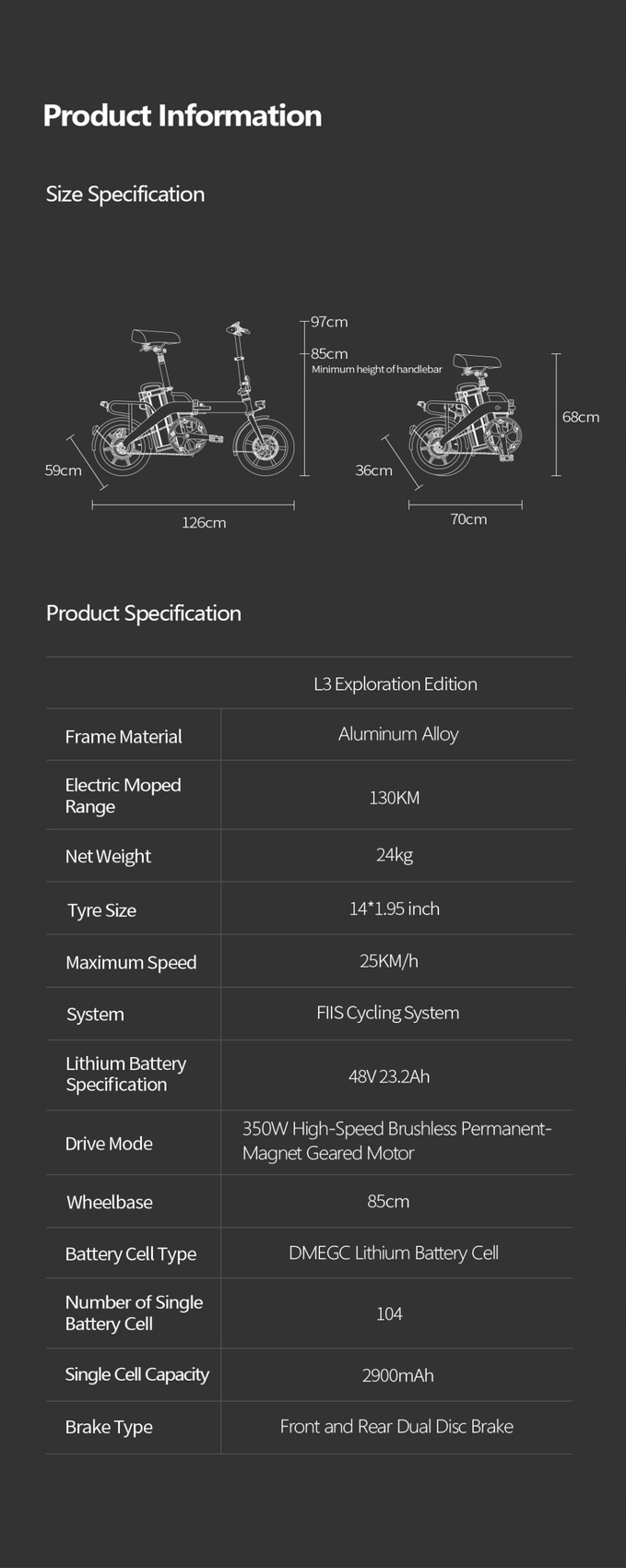 Wyposażony w akumulator o pojemności 48 V 23,2 Ah, cykle ładowania są ponad 1000 razy dłuższe niż w przypadku innych akumulatorów. L3 jest idealny dla użytkowników, którzy potrzebują większego zasięgu, ponieważ może przebiec 200 km w temperaturze otoczenia 25°C i obciążeniu 75 kg.